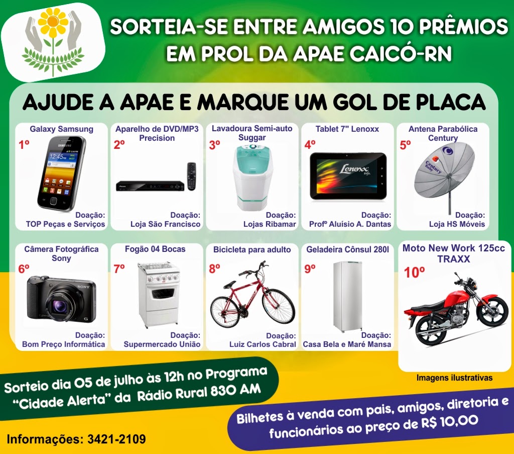 A APAE Caicó lançou a campanha “Ajude a APAE e marque um gol de placa”, onde a instituição está sorteando uma moto 125cc e mais nove ótimos prêmios. Os bilhetes custam apenas R$ 10,00 e estão sendo vendidos com pais, funcionários, diretoria, lojas parceiras e a comidade em geral. O sorteio será realizado dia 05 de julho às 12h no programa Cidade Alerta da Rádio Rural AM. Participe e boa sorte!