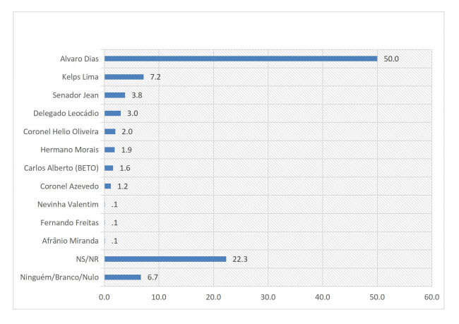 Em segundo, aparece o deputado Kelps Lima com 7,2% das intenções de voto. Ele é seguido pelo senador Jean Paul Prates com 3,8% e pelo delegado Sérgio Leocádio com 3%. Os demais nomes ficaram abaixo da margem de erro amostral. O total de indecisos foi de 22,3%. Brancos e nulos somaram 6,7%.
