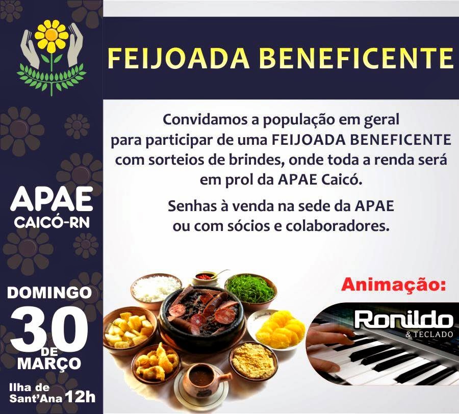 A Associação de Pais e Amigos dos Excepcionais, APAE Caicó-RN, convida toda a sociedade caicoense e de cidades vizinhas a participar da FEIJOADA BENEFICENTE com música ao vivo e sorteios de brindes, onde toda a renda será revertida em prol da referida instituição. O evento acontece hoje, dia 30 de março de 2014 às 12h na Ilha de Sant’Ana em Caicó. Senhas a venda no local.