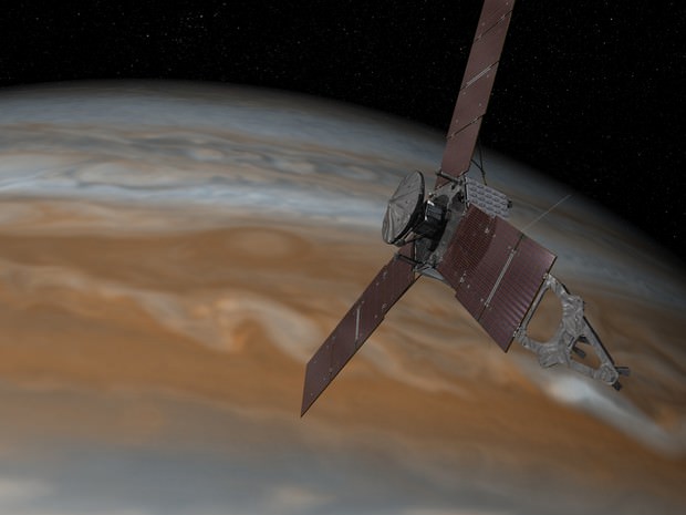 A sonda, de quatro toneladas, é movida por energia solar, se encontra atualmente a menos de 14 milhões de quilômetros de seu destino e efetuará uma série de voos a 4.667 km da espessa camada nublada do planeta gasoso, durante uma missão científica que durará 16 meses.