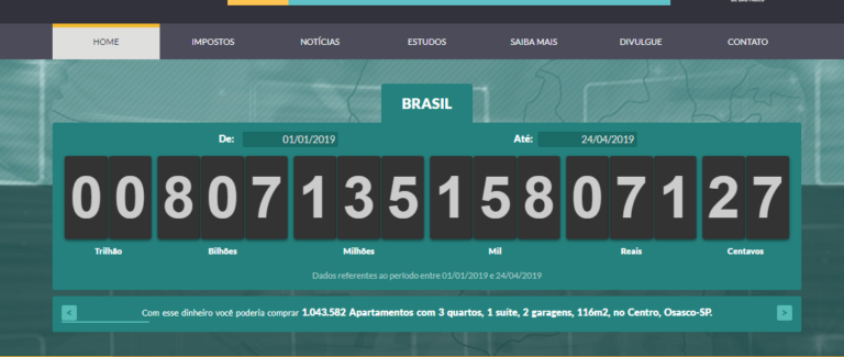 Este montante foi alcançado nove dias mais cedo na comparação com o ano passado, quando a marca de R$ 900 bilhões foi atingida no dia 17 de maio. Em 2018, o Impostômetro superou a marca de R$ 2,3 trilhões em impostos pagos pelos brasileiros no ano. O impostômetro foi criado em 2005 e busca estimar o valor total de impostos, taxas, contribuições e multas que a população brasileira paga para a União, os estados e os municípios.