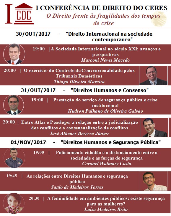 Com o tema “O Direito frente às fragilidades dos tempos de crise” acontecerá no final do mês de Outubro em Caicó, a 1ª Conferência de Direito do CERES, evento organizado por alunos do 4º período com apoio do professor Dr. Fabricio Germano Alves, que leciona cadeiras da área de Civil no referido curso.