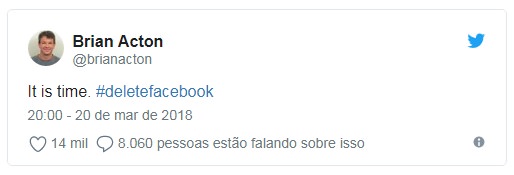 O cofundador do aplicativo de mensagens instantâneas WhatsApp Brian Acton fez uma rara demonstração pública nesta quarta-feira, 20: em sua conta no Twitter, ele sugeriu a qualquer pessoa que deletasse sua conta no Facebook. “É hora #deletefacebook”, disse Acton na publicação, seu primeiro tuíte em um mês.