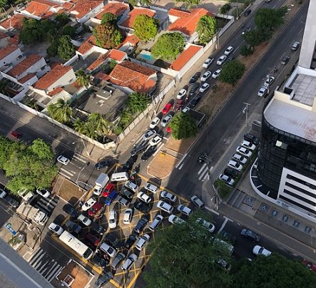 Com os semáforos apagados, os carros se aglomeraram no entrocamento entre as ruas. O cruzamento entre a Avenida da Integração e a Avenida Prudente de Morais ficou travado logo após o apagão. O mesmo aconteceu nos principais cruzamentos da cidade.