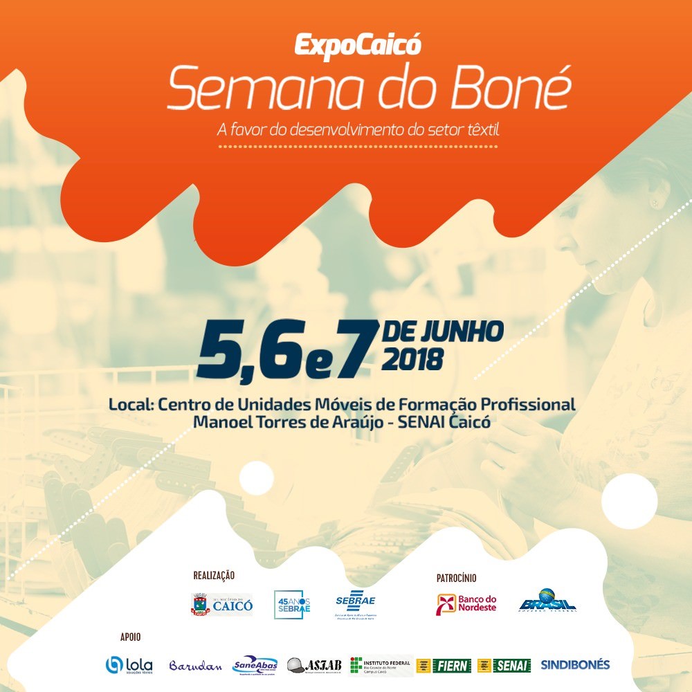 A tradição da indústria têxtil fez Caicó ganhar o mercado nacional e ser reconhecida como a capital Nordestina do Boné e do Chapéu. O setor boneleiro terá um destaque especial durante a EXPOCAICÓ 2018 e realizará, dessa terça até a quinta-feira, 05 a 07 de junho, a Semana do Boné. O evento acontecerá no Centro de Unidades Móveis do SENAI, na Praça Dom José Delgado, bairro Paraíba, sendo aberto ao público.