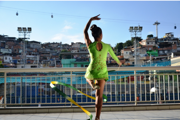 A foto de uma jovem ginasta ensaiando com sua fita e a favela como pano de fundo foi a vencedora do concurso. O autor da foto, Hugo de Lima Oliveira, 22 anos, mora no Complexo do Alemão, zona norte, e torce para que o Jogos Olímpicos sirvam de oportunidade para que os turistas visitem e conheçam as favelas.