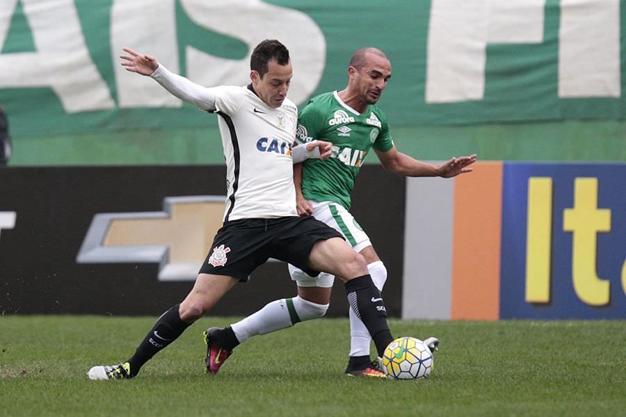 SC - BRASILEIRÃO/CHAPECOENSE X CORINTHIANS - ESPORTES - Rodriguinho (E), do Corinthians, disputa lance com Gil, da Chapecoense, em partida válida pela 14ª rodada do Campeonato Brasileiro, na Arena Condá, em Chapecó (SC), neste sábado. 09/07/2016 - Foto: MáRCIO CUNHA/MAFALDA PRESS/ESTADÃO CONTEÚDO