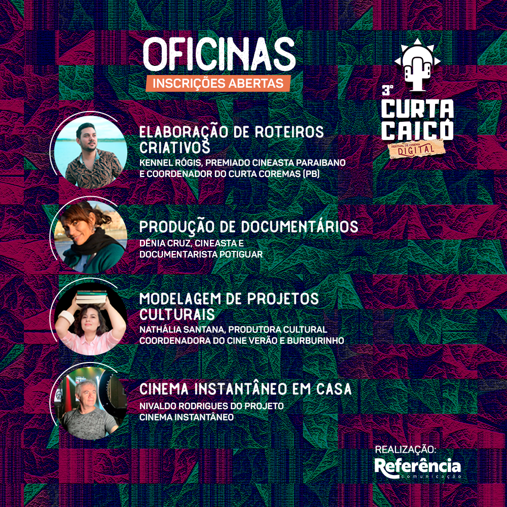 As oficinas serão realizadas em ambiente online e acontecem graças ao apoio do Edital de Economia Criativa do Sebrae do Rio Grande do Norte. O Festival realizará as seguintes oficinas: Cinema Instantâneo em Casa (Nivaldo Rodrigues), Produção de Documentários (Dênia Cruz), Modelagem de Projetos Culturais (Nathália Santana) e Elaboração de Roteiros Criativos (Kennel Rógis).