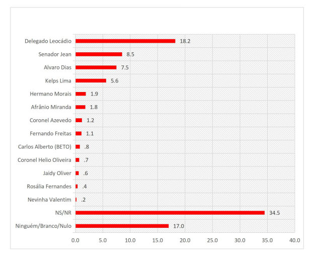 Ainda dentro dos números da pesquisa eleitoral para prefeito de Natal, o instituto Seta quis saber a rejeição dos candidatos, ou seja, aquele nome em que o eleitor não vota de maneira alguma. E nome o mais rejeitado pela população foi o delegado Sérgio Leocádio com 18,2% de rejeição. Em segundo aparece o senador Jean Paul Prates com rejeição de 8,5% da população. O terceiro mais rejeitado é o prefeito Álvaro Dias com 7,5%. Ele é seguido pelo deputado Kelps Lima com 5,6% de rejeição.