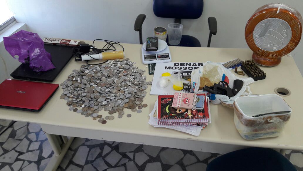 Policiais civis da Delegacia Especializada em Narcóticos (Denarc) de Mossoró apreenderam, na quarta-feira (12), em um apartamento no bairro Nova Betânia, 80g de cocaína, 200g de crack, cadernos de contabilidade de movimentação da droga, um revólver calibre 38, munições calibre 38, 45 e 9mm, notebooks, balanças de precisão e uma grande quantidade de dinheiro fracionado em moedas.