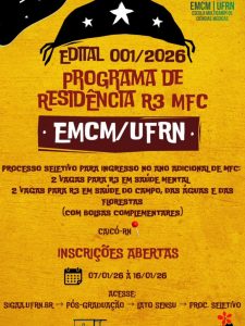 A Escola Multicampi de Ciências Médicas da Universidade Federal do Rio Grande do Norte (EMCM/UFRN) lançou o edital nº 001/2026 do Programa Residência R3 em Medicina da Família e Comunidade (MFC), com vagas destinadas ao município de Caicó, no Seridó potiguar. O processo seletivo é voltado para o ingresso no ano adicional da residência médica.