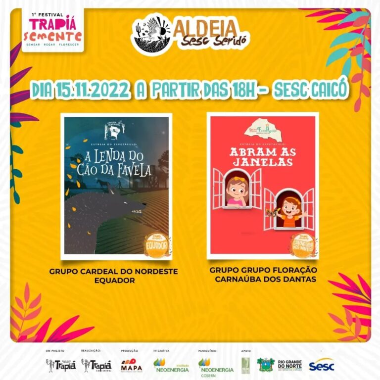 A programação da Aldeia SESC no Sesc Seridó traz neste feriado do dia 15, dois espetáculos gratuitos, do Festival Trapiá Semente, que há seis meses estavam em preparação com oficinas para criação de roteiro, interpretação de texto e montagem de espetáculo com adolescentes.