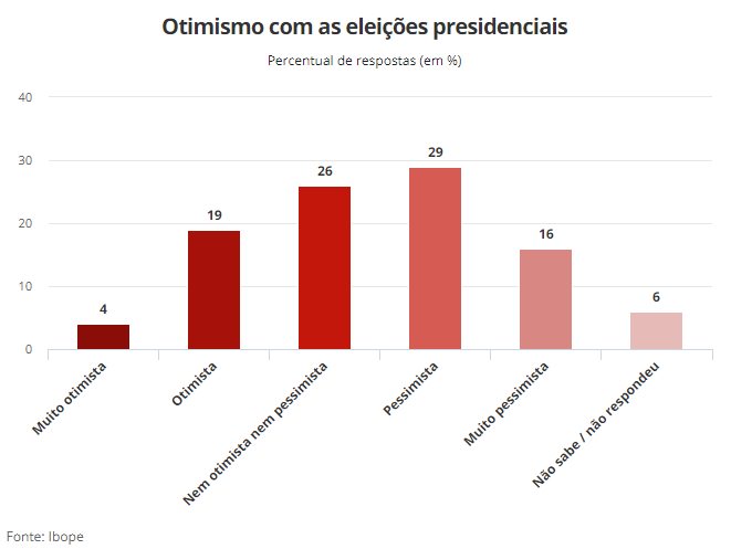 Pesquisa Ibope divulgada nesta quinta-feira (2) mostra que quase metade do eleitorado (45% dos entrevistados) se diz “pessimista” ou “muito pessimista” com a eleição deste ano para presidente da República. De acordo com o instituto de pesquisa, o elevado pessimismo resulta em baixo interesse do eleitorado pelas eleições de outubro.