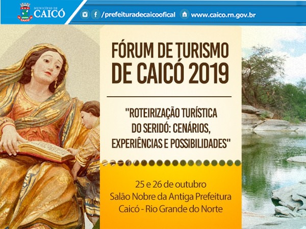 O 3º Fórum de Turismo de Caicó será realizado dias 25 e 26 de outubro, no Salão Nobre da antiga Prefeitura Municipal, com o tema: “ROTEIRIZAÇÃO TURÍSTICA DO SERIDÓ: CENÁRIOS, EXPERIÊNCIAS E POSSIBILIDADES”. O Fórum integra a programação de eventos da Festa do Rosário, sendo considerado importante tanto do ponto de vista científico como do mercado turístico. A abertura do Fórum acontece nesta sexta-feira (25), às 13 horas, quando será realizado o credenciamento e em seguida, a programação segue com a realização das palestras.