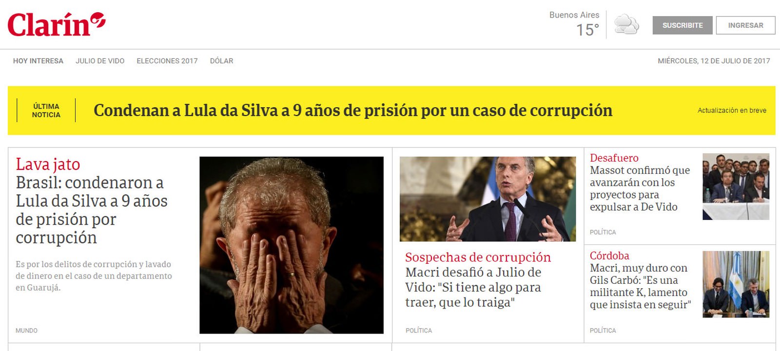 O jornal argentino “El Clarín”, que dá destaque para a notícia na capa de seu site, lembra que esta é a primeira condenação a um político do PT no âmbito da Operação Lava-Jato e que a sentença deve ser confirmada em segunda instância pelo Tribunal Regional Federal. O “La Nación”, também da Argentina, ressalta que, apesar da condenação de Lula não ser exatamente uma surpresa, ela vem em um momento de extrema tensão política no Brasil, incluindo a denúncia do atual presidente, Michel Temer.