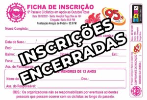 Estão encerradas as inscrições para o 6º Passeio Ciclístico Outubro Rosa de Caicó. Ao todo foram disponibilizadas pela organização do evento 300 inscrições. O Passeio será no sábado, dia 09 de Outubro e é uma realização dos Amigos do Pedal com a 95,9 FM que completa neste mês de outubro 34 anos de existência.