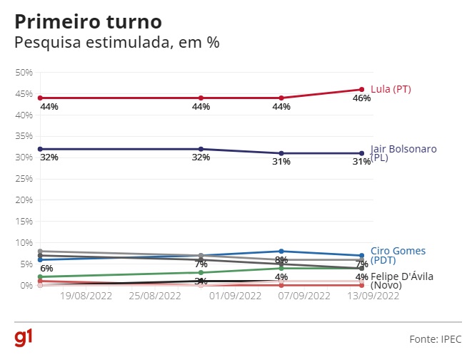 Em relação ao levantamento anterior do Ipec, de 5 de setembro, Lula oscilou dentro da margem de erro, de dois pontos percentuais para cima ou para baixo –antes, tinha 44%; Bolsonaro se manteve com o mesmo percentual de então.