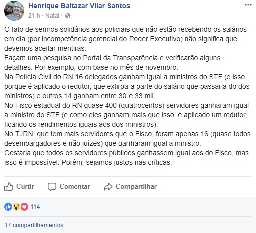 Em meio à crise e à convocação dos poderes para dar sua contribuição para solução fiscal do Rio Grande do Norte, o juiz Henrique Baltazar utilizou sua conta no Facebook para ilustrar a disparidade de salários dentro do próprio Executivo, que enfrenta dificuldades para quitar salários e de onde partem críticas sobre a responsabilidade dos demais órgãos do RN.