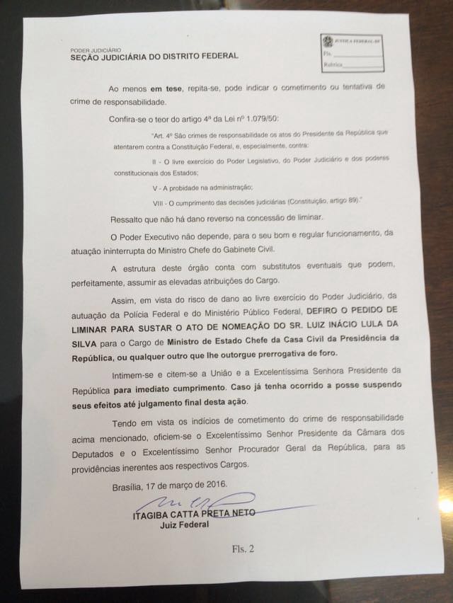 O Juiz Federal Itagiba Cattapreta suspendeu, liminarmente, a posse do ex-presidente Luís Inácio Lula da Silva, como ministro-chefe da Casa Civil, ocorrida na manhã desta quinta-feira (17).