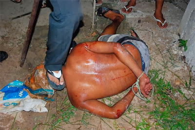 O repórter fotográfico José Aldenir, que fez imagens do suspeito sendo agredido, contou ao G1 que a Polícia Militar só chegou ao local na madrugada desta quarta (12). Na foto, é possível ver um homem segurando um bastão de madeira enquanto pisa no pescoço do homem amarrado. O suspeito tem um saco plástico envolvendo a cabeça e as mãos atadas com cordas.