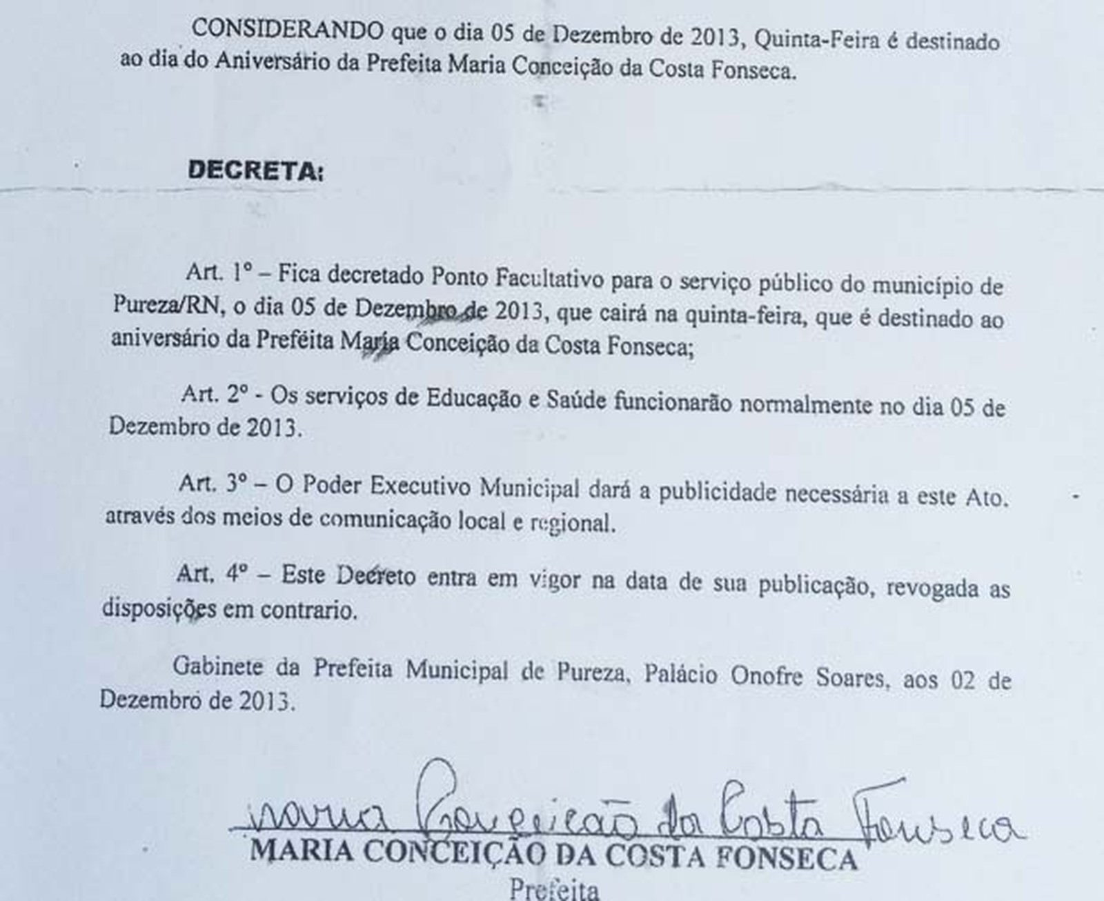 pureza2O Ministério Público do Rio Grande do Norte denunciou uma ex-prefeita de Pureza à Justiça potiguar por crime de responsabilidade. Maria da Conceição da Costa Fonseca declarou o dia 5 de dezembro de 2013 como ponto facultativo no município, sob a justificativa de ser o dia de seu próprio aniversário.