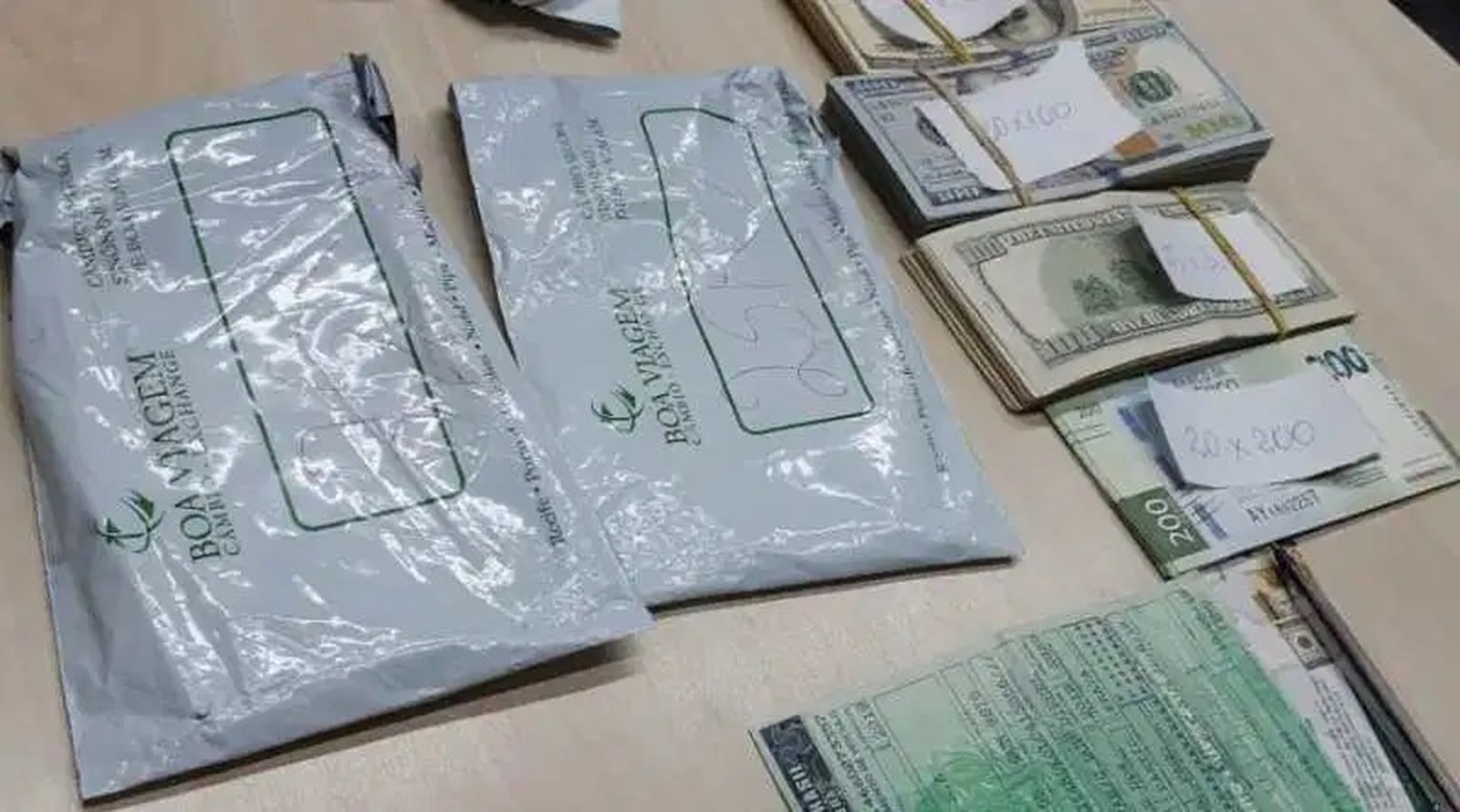 Após vistoria, os policiais encontraram com a passageira os dólares e pesos mexicanos. O dinheiro estava em envelopes de plástico, com a logomarca de uma operadora de câmbio da cidade de Recife (PE).