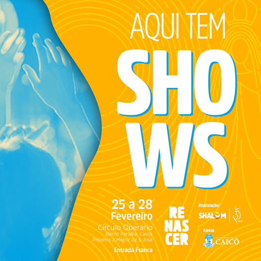 O Renascer é o retiro de carnaval da Comunidade Católica Shalom que acontece todos os anos em mais de 80 cidades no Brasil. Em Caicó, neste ano mariano, o evento chega a sua sexta edição e vai acontecer de 25 a 28 de fevereiro, no Círculo Operário, no Centro da cidade, próximo à praça Dom José Delgado.
