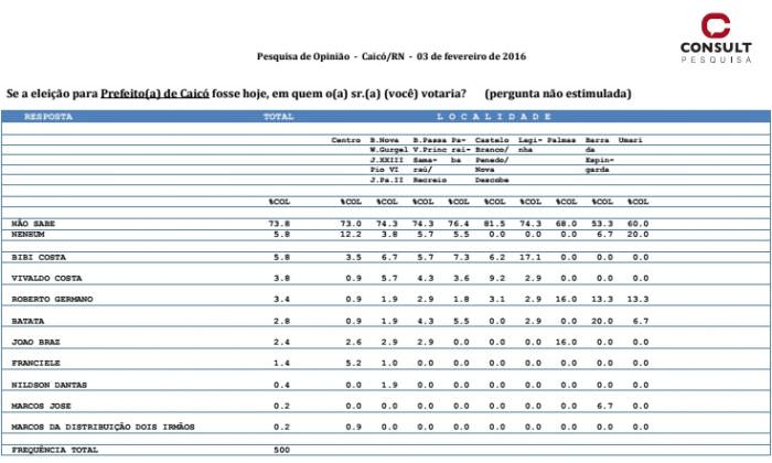 Vale lembrar que esse cenário é utilizado para saber quais candidatos estão na boca do povo, mas que nas eleições serão apresentados os nomes aos eleitores nos 45 dias de campanha. Ainda nesse cenário, em segundo aparece o deputado estadual Vivaldo Costa com a preferência de 3,8% dos caicoenses a frente do atual prefeito Roberto Germano (3,4%), do vereador Batata (2,8%) e do advogado João Braz (2,4%).