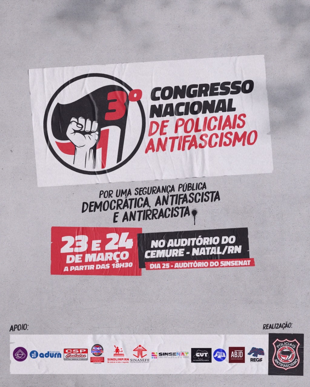 A terceira edição do Congresso Nacional de Policiais Antifascismo acontecerá no auditório do Cemure (bairro de Cidade da Esperança), na cidade de Natal/RN, nos dias 23 e 25 de março de 2022 (no Dia 25, no Auditório do Sinsenat, em Cidade Alta), sempre no período noturno, por volta das 18:30h às 22h.