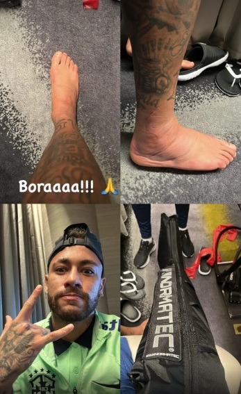 Neymar fez um post neste sábado mostrando imagens do seu tratamento no tornozelo direito. O local, lesionado na vitória por 2 a 0 sobre a Sérvia, na estreia da Copa do Mundo, ainda está muito inchado. Neymar tem feito tratamento intensivo para ficar à disposição de Tite para o mata-mata.