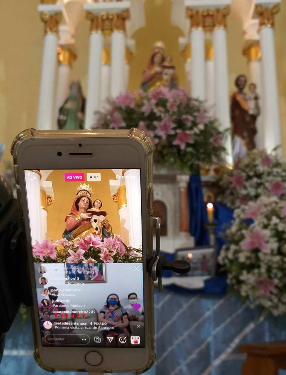 Da Igreja Matriz, o Padre Cláudio, deu início à celebração transmitida pelo instagram @festadesantanacn. Dividindo tela o casal Chicão e Edwiges, ao lado dos seus filhos, que moram no Bairro Manoel Salustino, abriram imagem da sala da casa. Eles foram os primeiros que receberam virtualmente a peregrinação de Santa’Ana.