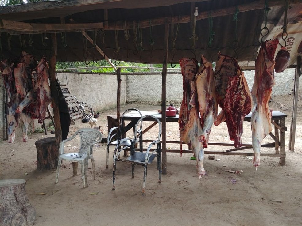 Dentro de um freezer, os policiais encontraram vários pedaços de carne, além dos três animais abatidos no chão e outros cinco pendurados por ganchos. Em um curral logo ao lado, estavam ainda outros oito bovinos, todos vivos.