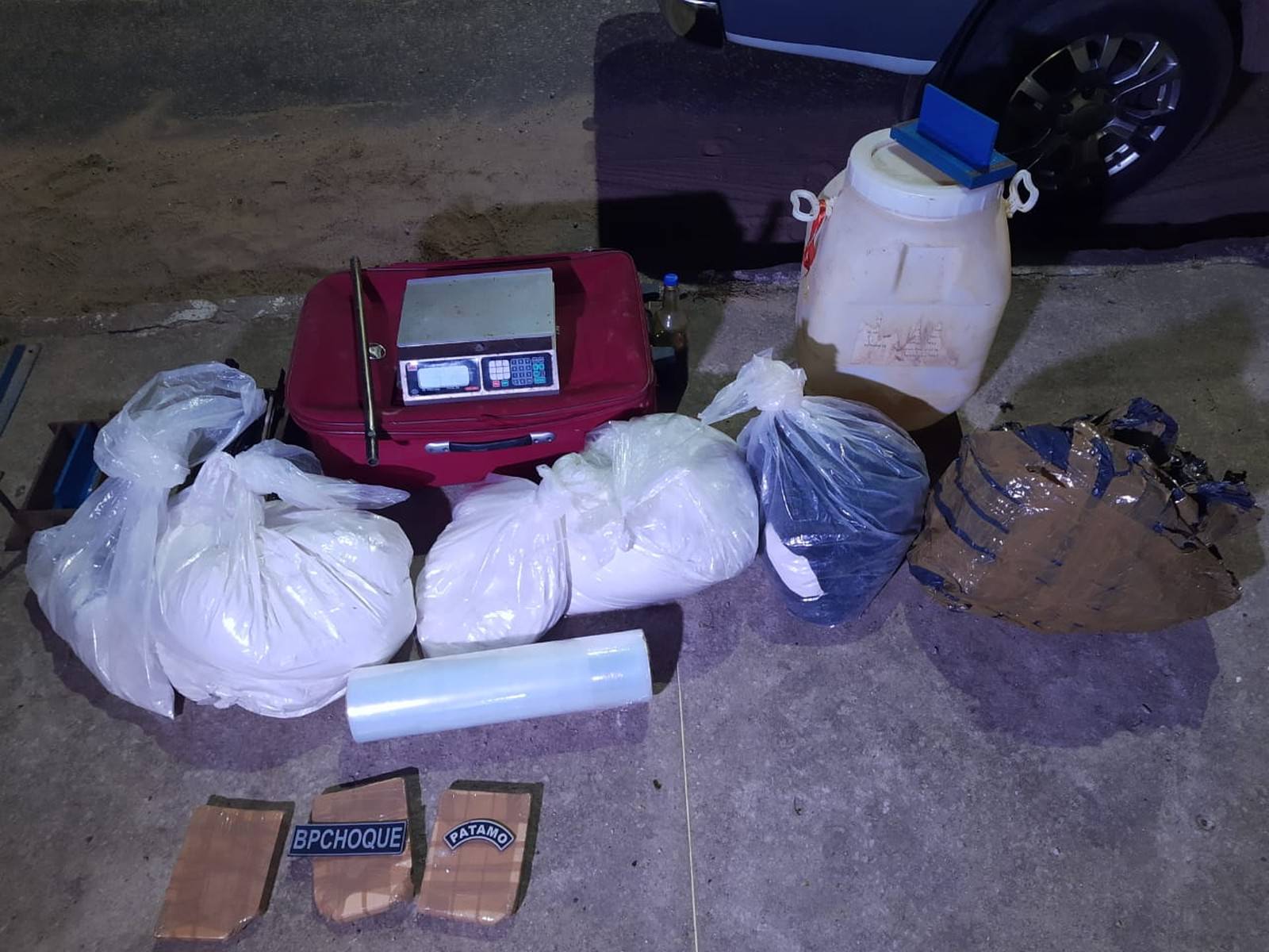 Os PMs foram até a casa onde funcionava um laboratório de drogas. Lá, além da substância, eles encontraram balança de precisão, tonéis, prensa hidráulica e sacos plásticos que seriam utilizados na comercialização da pasta base de cocaína. Segundo a PM, o material ilícito abasteceria a região metropolitana de Natal e até outros estados.
