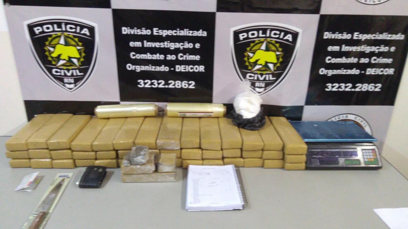 Policiais civis da Divisão Especializada em Investigação e Combate ao Crime Organizado (Deicor) apreenderam cerca de 51 quilos de drogas e prenderam um homem de 29 anos na tarde deste sábado (3), em Parnamirim, na Grande Natal. Segundo os investigadores, o homem é suspeito de integrar uma organização criminosa voltada para prática de homicídios e tráfico de drogas.