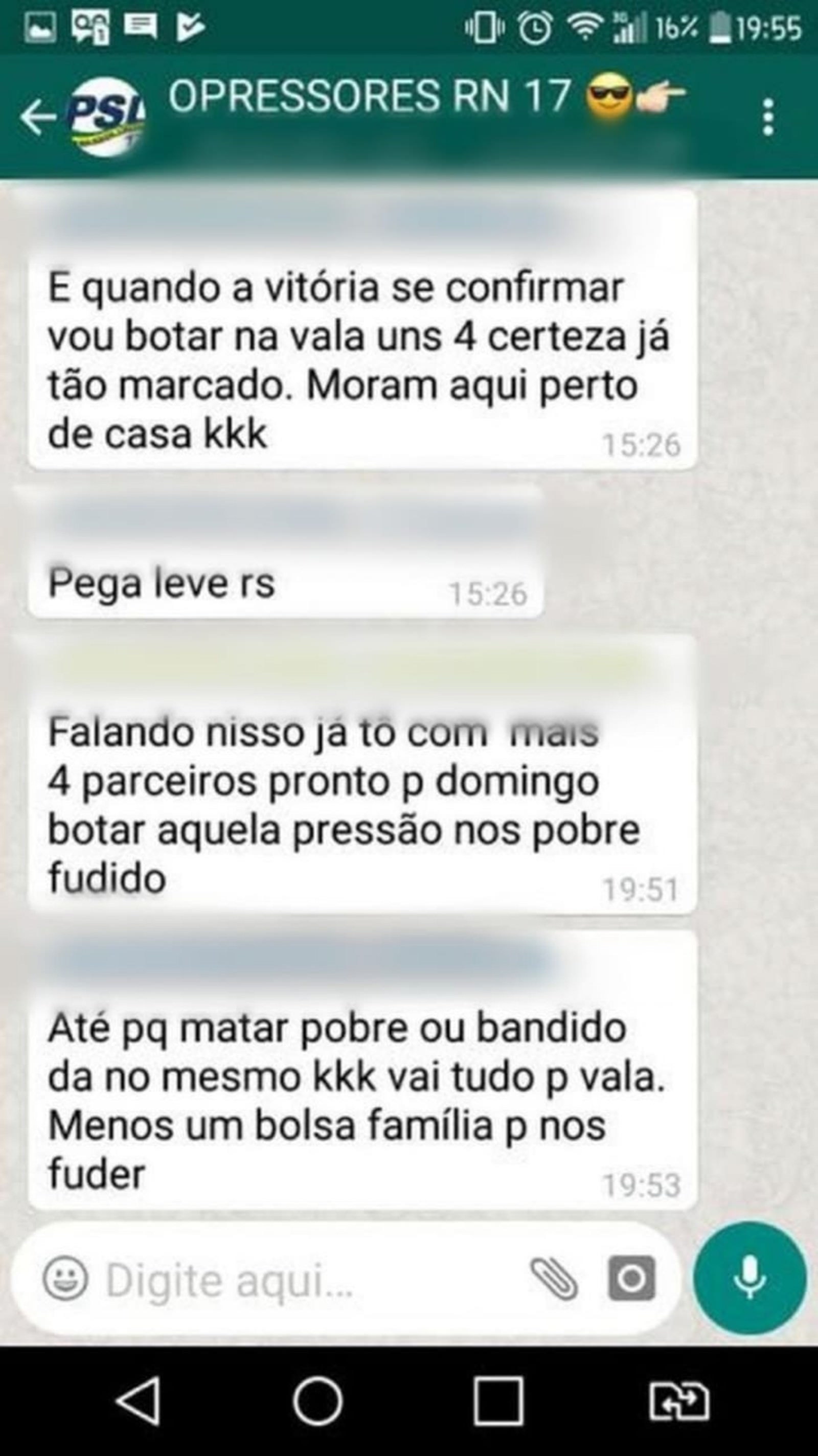 A Polícia Civil e o Ministério Público Eleitoral do Rio Grande do Norte estão apurando a origem e a veracidade de mensagens de um suposto grupo de WhatsApp intitulado “Opressores RN 17”, nas quais são relatadas ameaças alegadamente feitas a eleitores de Jair Bolsonaro (PSL), candidato à Presidência da República. No grupo, também são feitas promessas de estupro, morte e outros tipos de violência contra esses eleitores após o 2º turno, em 28 de outubro.