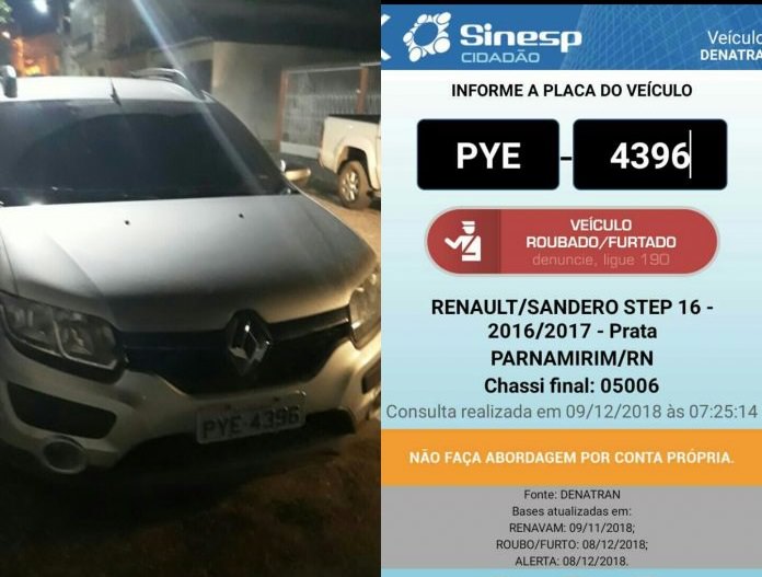 O veiculo estacionado chamou à atenção, fazendo com que o comandante da RP 01 entrasse em contato com a Central de Operações da Polícia Militar (COPOM) que fez uma consulta na placa do carro. Na busca o Renault Sandero Step 16, ano 2016/2017, de cor prata de Parnamirim/RN e placa PYE 4396 estava constando como veiculo roubado.