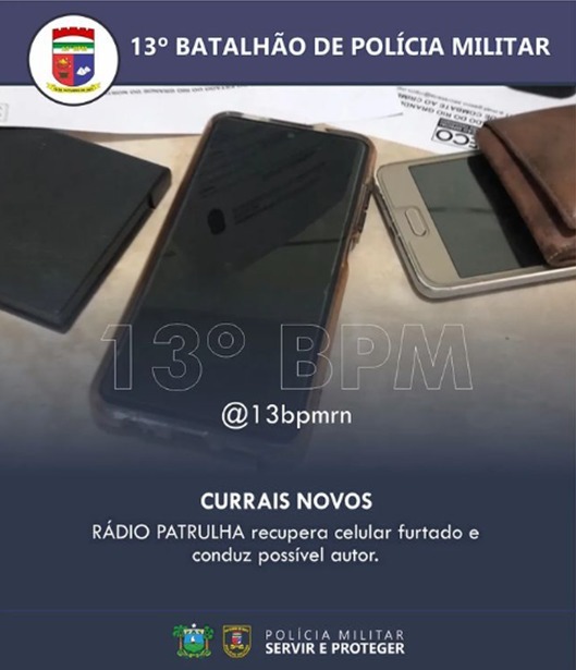 O 13º Batalhão de Polícia Militar, em sua 1ª companhia, por meio da Rádio Patrulha em Currais Novos, prendeu homem e recuperou um celular furtado. Em patrulhamento pela cidade na segunda-feira (17), a guarnição da Rádio Patrulha visualizou um indivíduo com as características próximas às do possível autor do furto de um celular em um supermercado na cidade.
