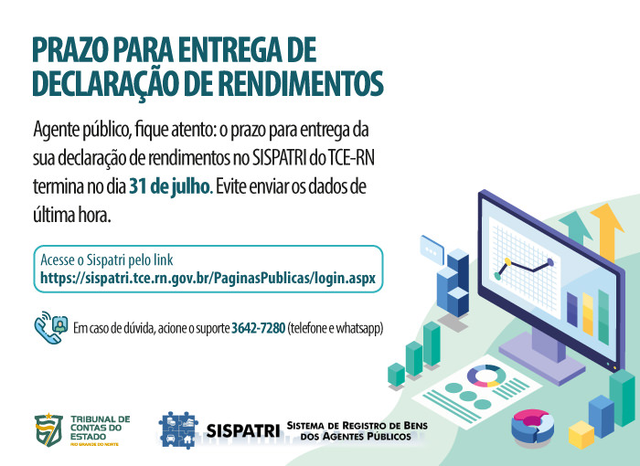 Sispatri-siteO prazo para agentes públicos enviarem a declaração de bens e rendimentos ao Tribunal de Contas do Estado (TCE-RN) termina no próximo dia 31 de julho. A entrega é obrigatória e deve ser realizada por meio do sistema Sispatri, clique AQUI para ter acesso ao link . O prazo inicial, 31 de maio, foi prorrogado em razão da pandemia de coronavírus.