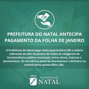 A Prefeitura de Natal paga nesta quarta-feira (29/01) o salário referente ao mês de janeiro de todas as categorias do funcionalismo público municipal, entre ativos, inativos e pensionistas. As informações estão sendo enviadas pela Secretaria Municipal de Administração (Semad) à instituição financeira responsável pelo crédito nas contas e os servidores poderão movimentar o dinheiro na manhã desta quinta-feira (30/01).