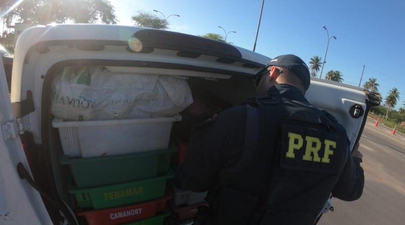 Durante fiscalização, por volta das 6h30, os policiais abordaram uma Fiorino branca. Ao realizar vistorias no interior do veículo, foi encontrada uma carga de 560kg de camarão, sem a devida comprovação fiscal.