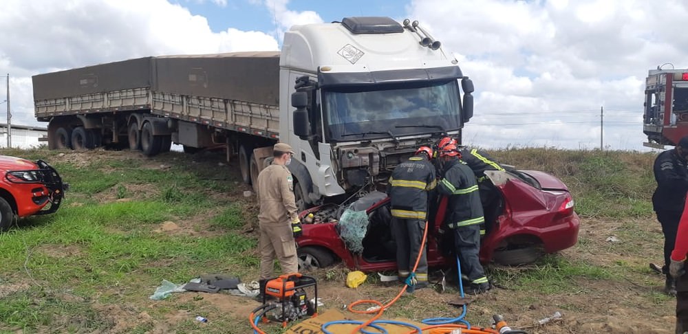 O Corpo de Bombeiros e Samu foram acionados para atender a ocorrência. O acidente aconteceu por voltas das 12h no Km 257 da rodovia. O carro de passeio modelo prisma, cor vinho, foi atingido lateralmente pela carreta. Após a batida, os veículos foram parrar em uma área descampada às margens da BR. O motorista do carro foi socorrido por uma ambulância do Samu em estado grave. Ainda não há informações sobre os ocupantes da carreta.