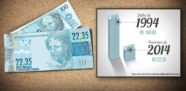 Ao longo de quase 20 anos do Plano Real, a inflação acumulada desde 1/07/1994 até 1/2/2014, medida pelo IPCA, foi de 347,51%. Assim, um produto que custava R$ 1,00 em 1994 custa hoje R$ 4,47. O matemático financeiro José Dutra Vieira Sobrinho afirma que, em decorrência desse fato, a cédula de R$ 100,00 perdeu 77,65% do seu poder de compra desde o dia em que passou a circular.
