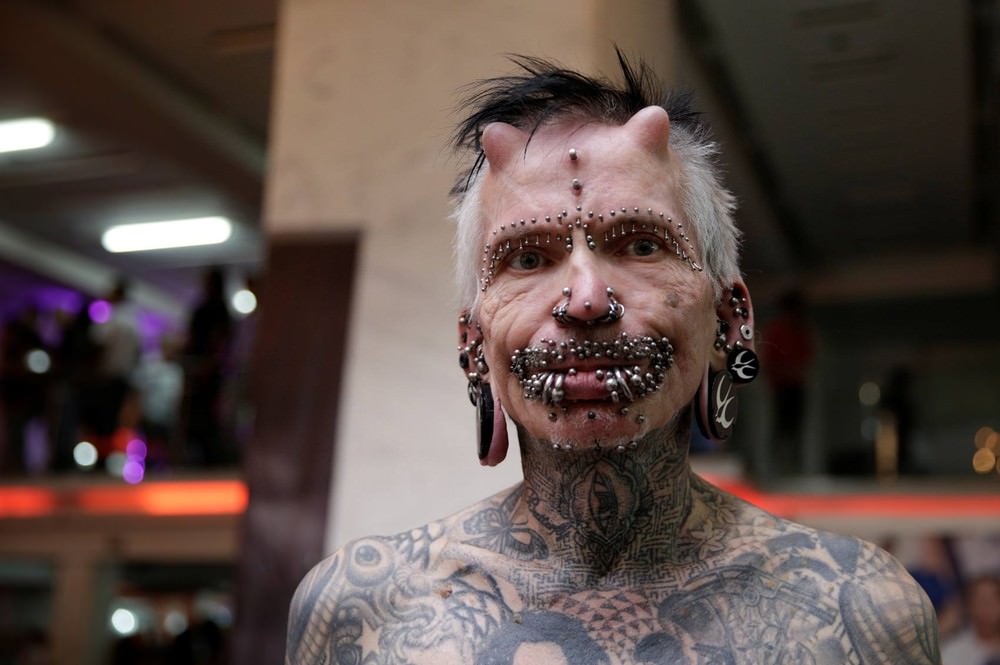 rolf-buchholzAlemão Rolf Buchholz, que aparece no livro Guinness como o homem com maior número de piercings no corpo, foi destaque de uma feira de tatuagem em Caracas, na Venezuela, no último fim de semana. Além de centenas de percings, ele conta com chifres implantados na testa.