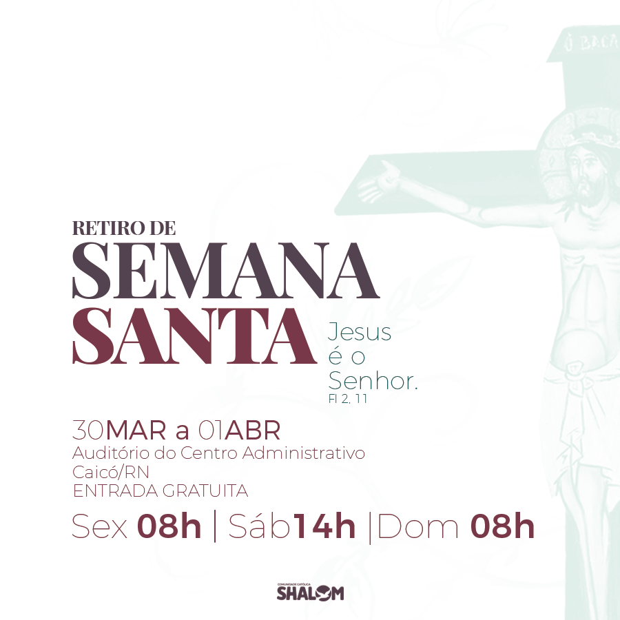 Semana-Santa-2018Com o tema “Jesus é o Senhor”- Fl 2, 11, a Comunidade Católica Shalom realiza em todo o Brasil e em vários países do mundo o seu Retiro de Semana Santa. Em Caicó/RN, o evento acontecerá de 30 de Março a 1 de abril na Prefeitura Municipal (Centro Administrativo – Av. Cel. Martiniano, Centro), com entrada gratuita.