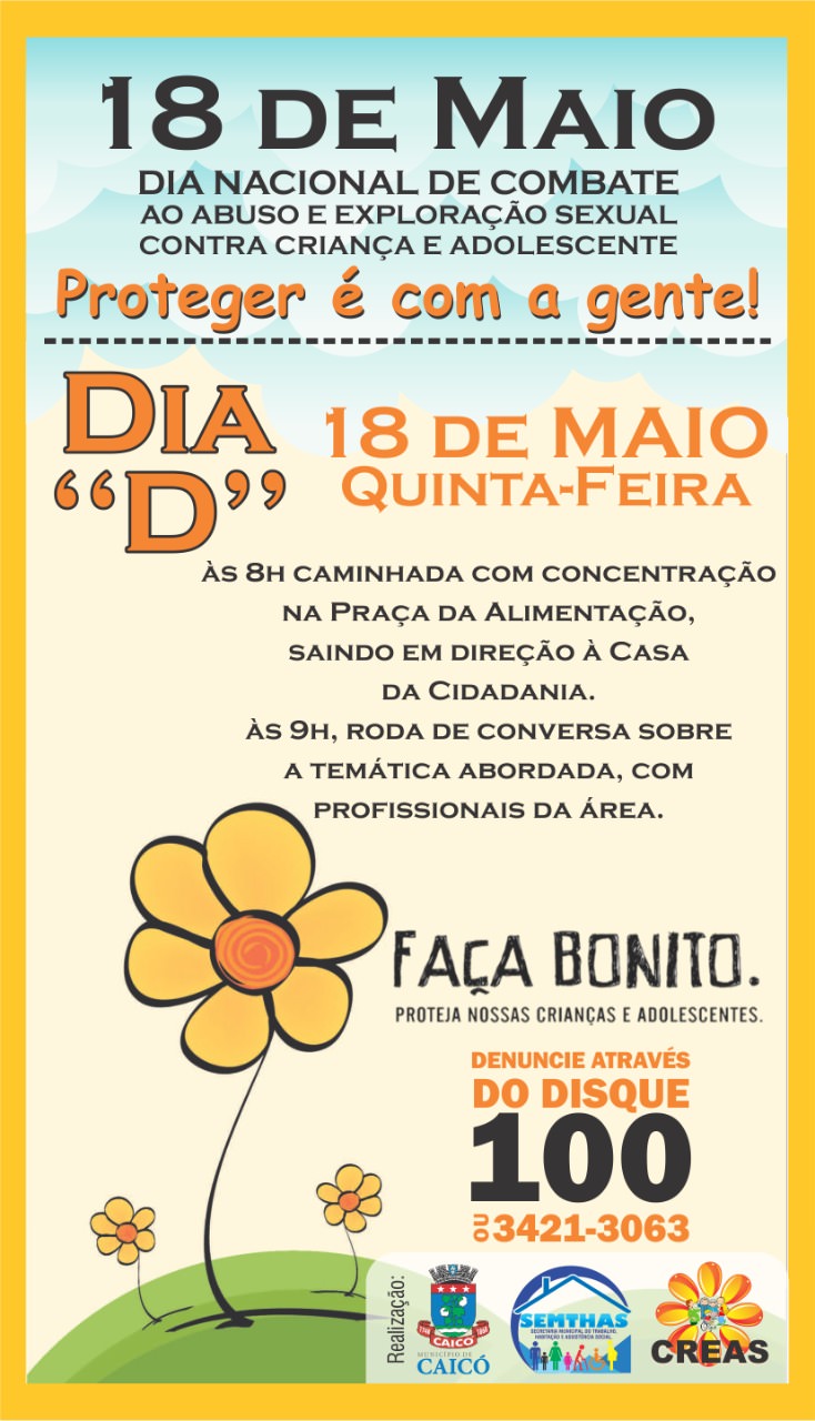 d1A Secretaria Municipal do Trabalho, Habitação e Assistência Social de Caicó organizou uma programação especial para o 18 de maio – Dia Nacional de Enfrentamento ao Abuso e à Exploração Sexual de Crianças e Adolescentes.