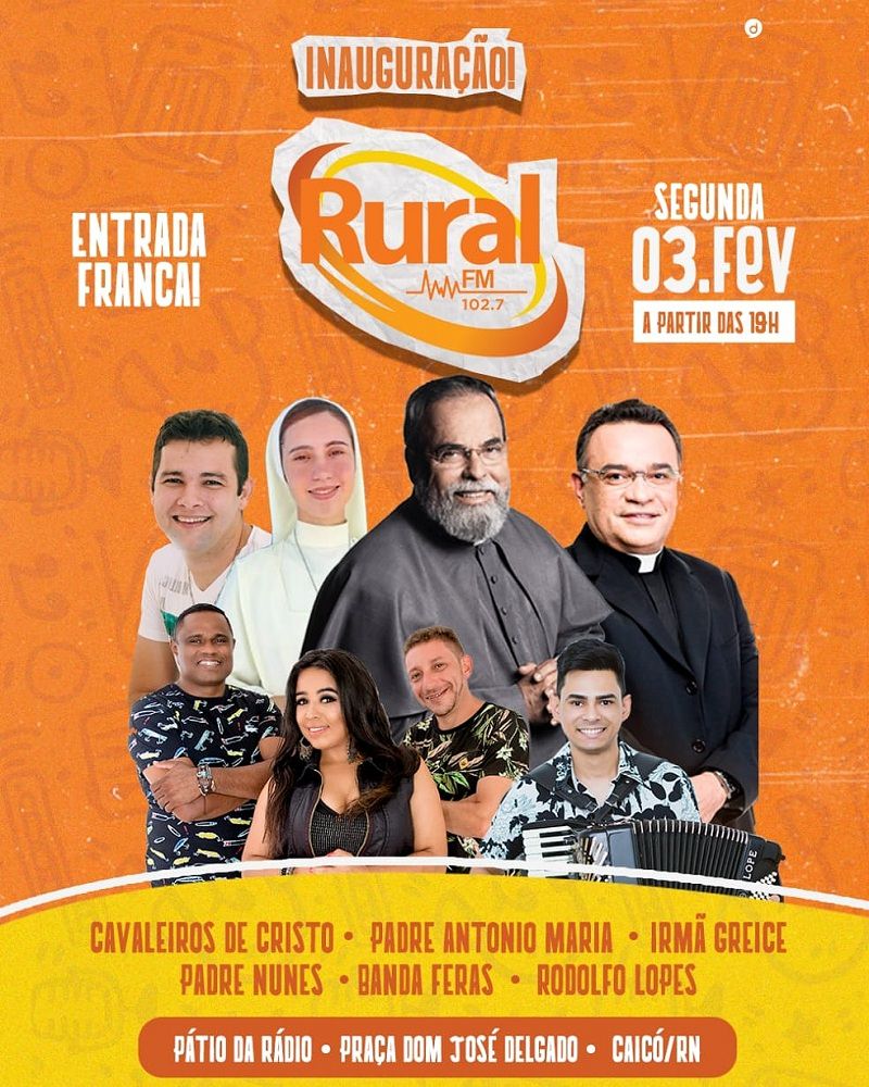 Contagem regressiva para o show de inauguração da nova Rural FM 102,7. Será nesta segunda-feira (03), a partir das 19h30 no pátio da Igreja Matriz de São José, ao lado do Colégio Diocesano Seridoense, em frente à Praça Dom José Delgado em Caicó.