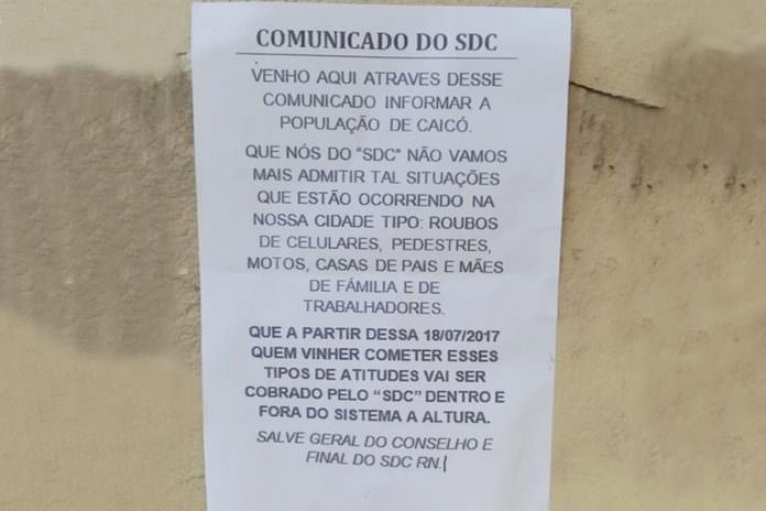 Este cartaz foi afixado na Escola Monsenhor Walfredo Gurgel onde a facção informou que “Nós do SDC não vamos mais admitir tal situações que estão ocorrendo na nossa cidade tipo: roubos de celulares, pedestres, motos, casa de pais e mães de família e de trabalhadores”.