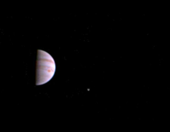 A foto foi tirada no dia 10 de julho, quando a sonda estava a uma distância de 4,3 milhões de quilômetros de Júpiter. Na imagem, são visíveis formações atmosféricas no planeta, incluindo a Grande Mancha Vermelha, além de três dos quatro maiores satélites do planeta.