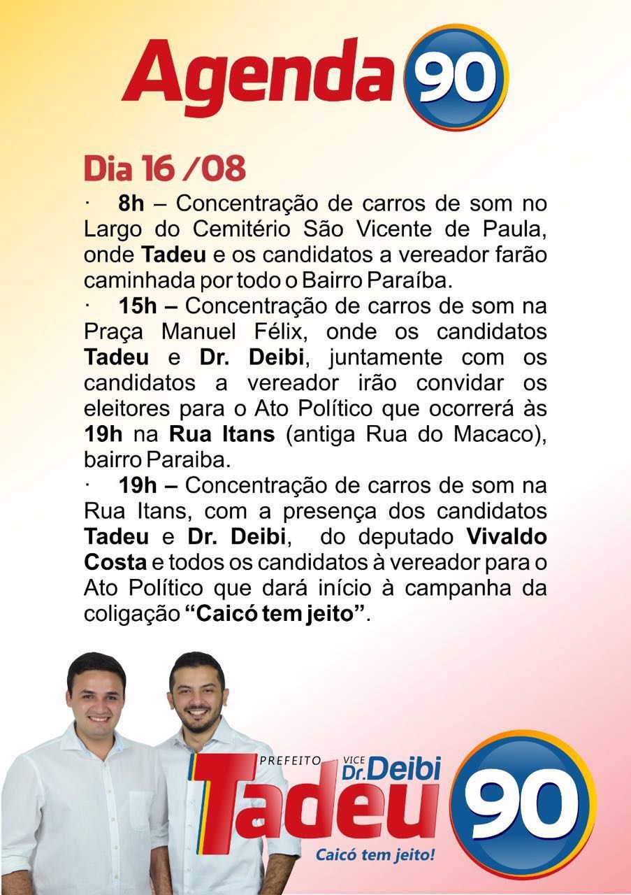 O candidato a prefeito de Caicó, Judas Tadeu (Pros) e o vice Deibi Dantas (Pros), junto com os candidatos a vereador da coligação “Caicó tem Jeito” terão agenda cheia, nesta terça-feira (16), primeiro dia de campanha.