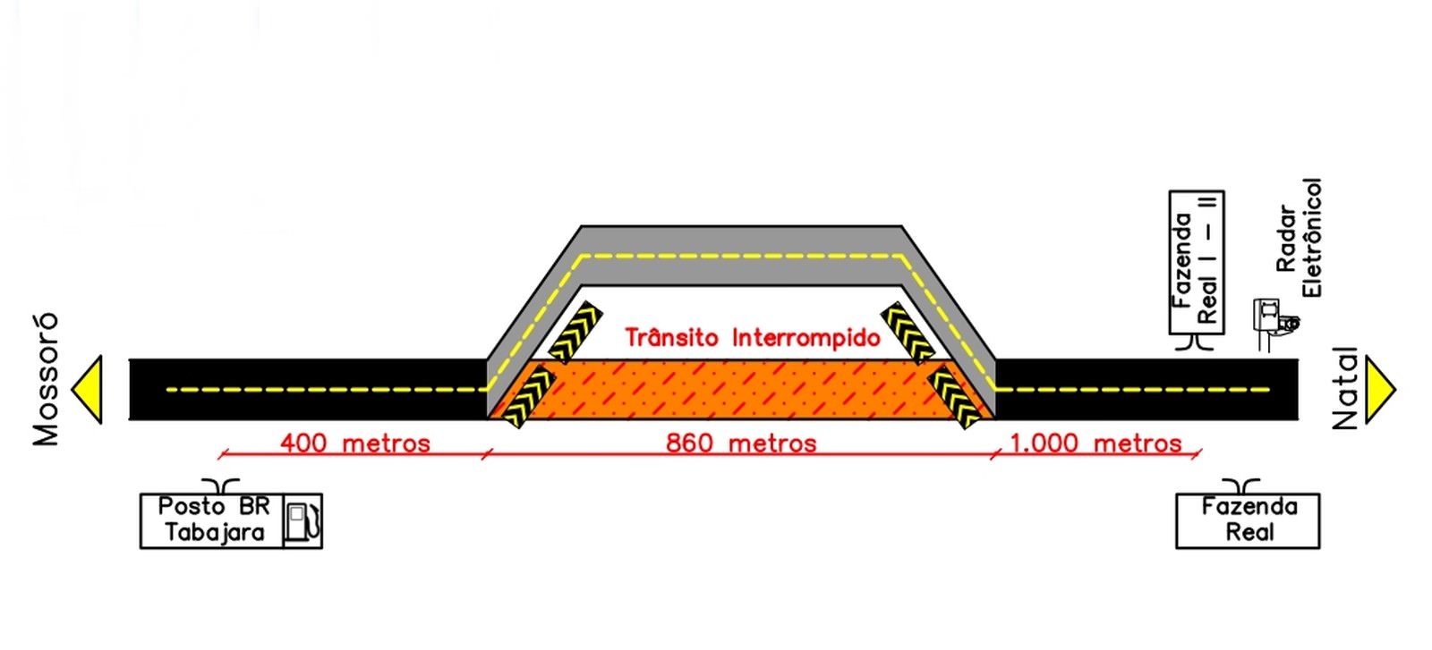 Segundo o Departamento Nacional de Infraestrutura de Transportes (Dnit), o desvio se faz necessário em razão da construção de um viaduto entre os quilômetros 284 e 285 da BR-304, conforme croqui acima.